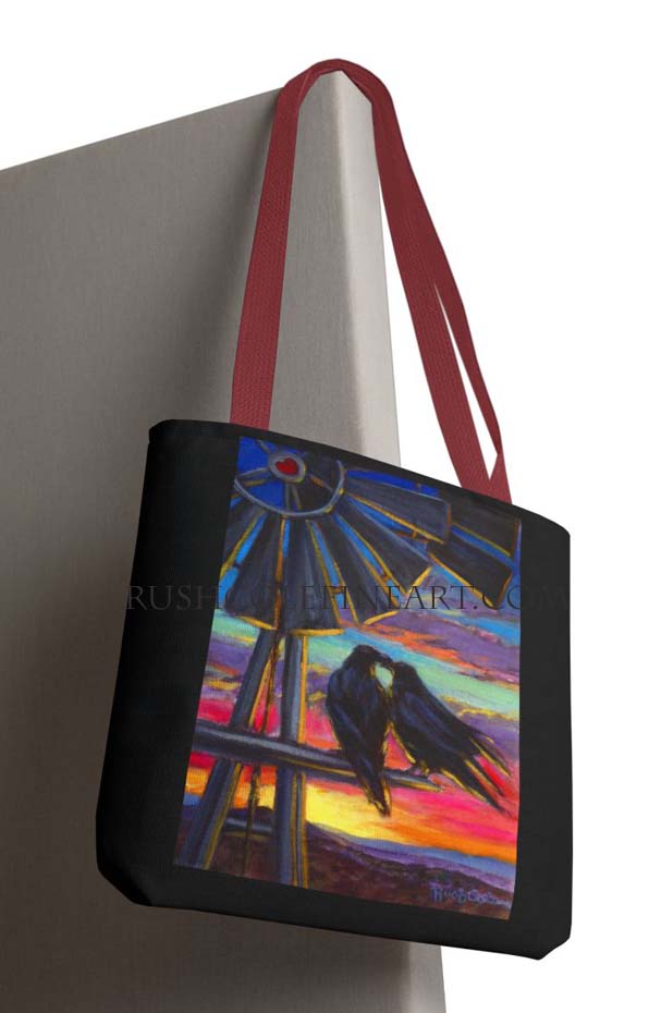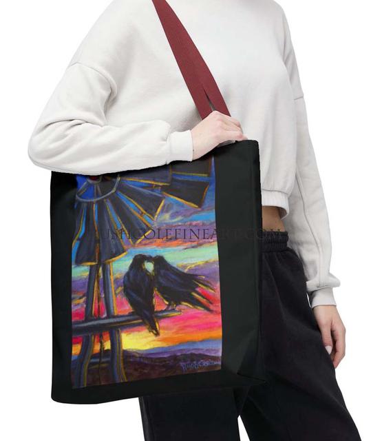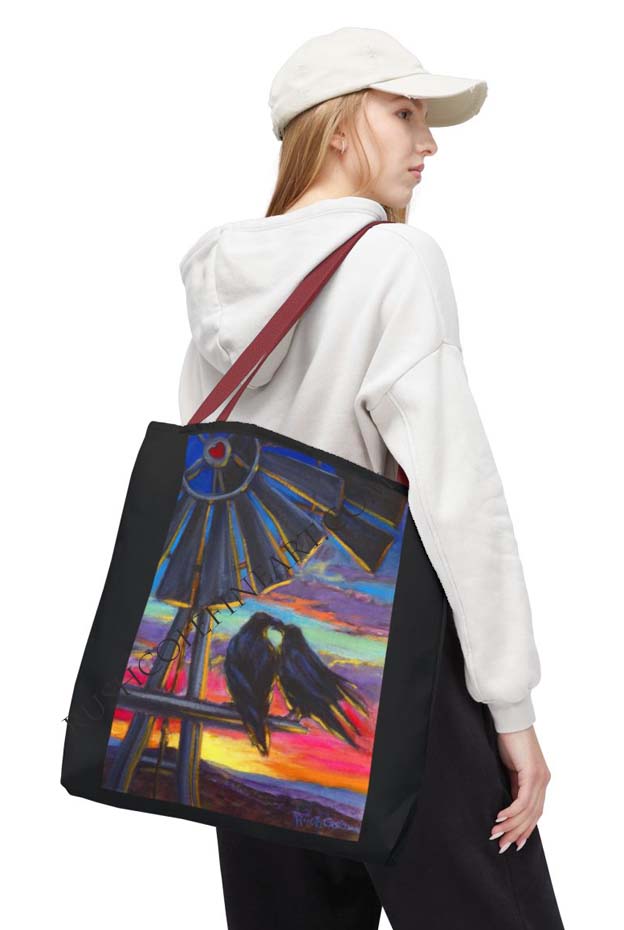 A durable, artful tote that feels like carrying a small sunset everywhere you go. Recreated from Rush Cole's original oil painting, "AN AFFAIR TO REMEMBER", this vivid image features two large birds perched against a windmill in silhouette at dusk, with colors melding from molten pinks to deep indigo, framed by black side panels.