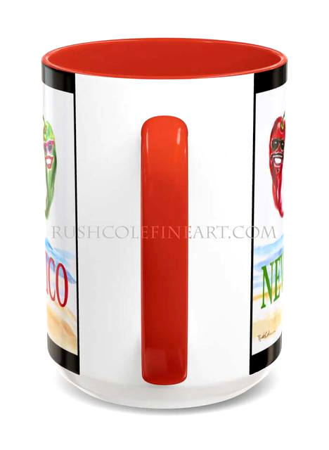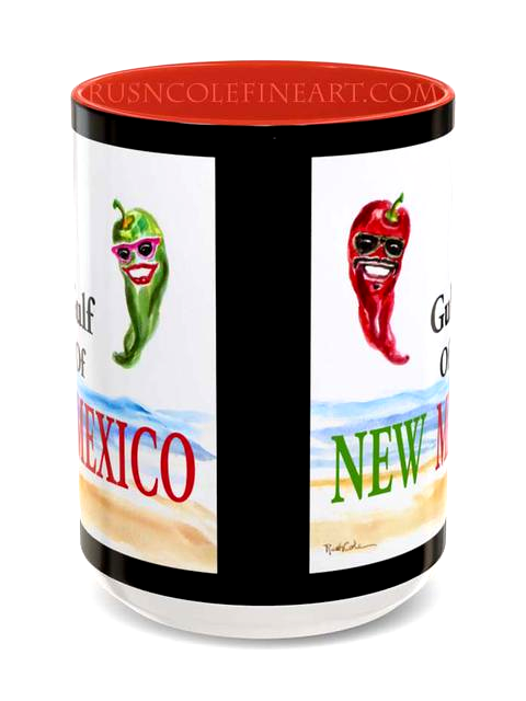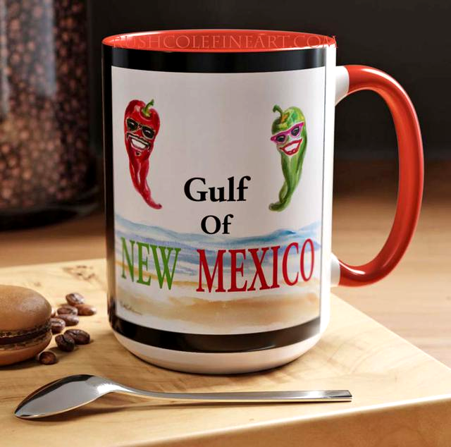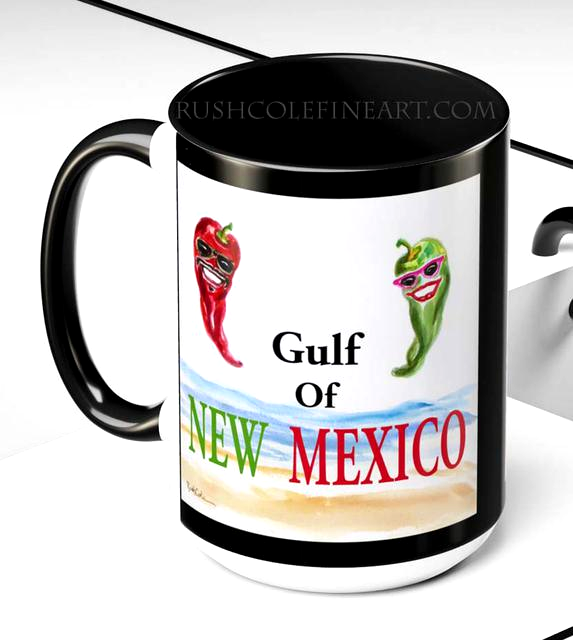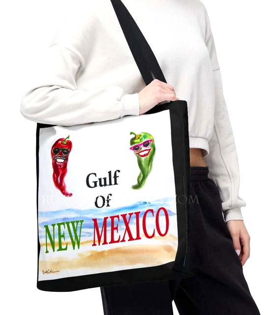A durable, artful tote that reminds everyone that true geography can easily exist in our own minds, whether anyone else agrees, or not! Recreated from Rush Cole's original artwork, "GULF OF NEW MEXICO", this cheery image features red and green chile from the famous state of New Mexico, home to the even more well-known beachfront gulf!