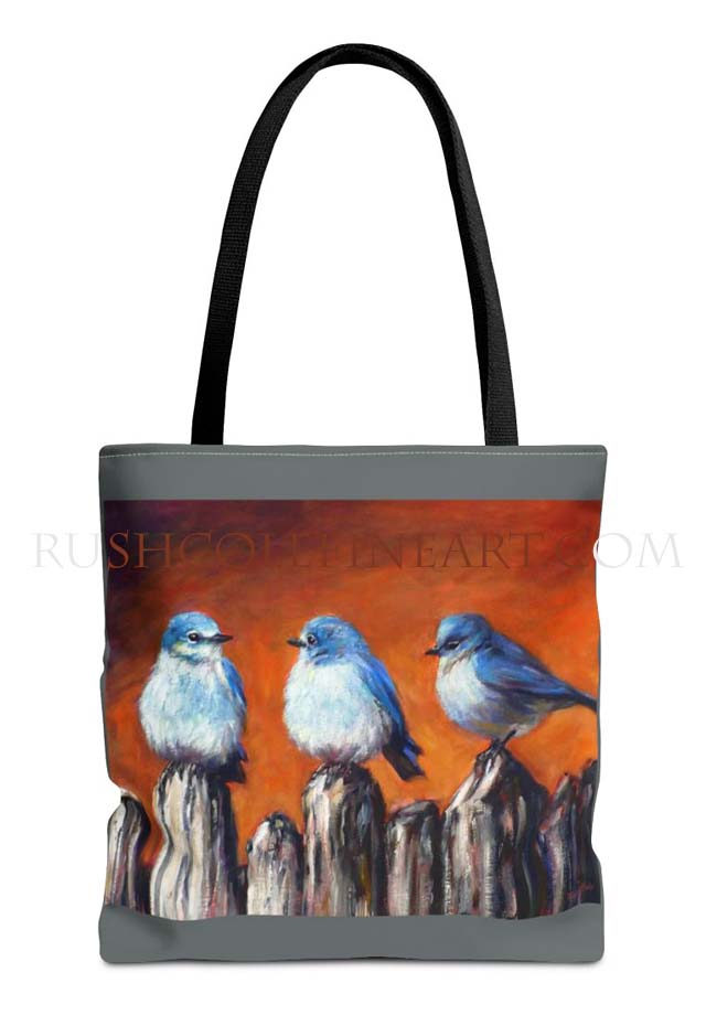 "BLUE HAPPY", oil on canvas painting, was inspired by a trio of azure-colored mountain bluebirds perched on the coyote fence outside the artist's studio on a winter afternoon.