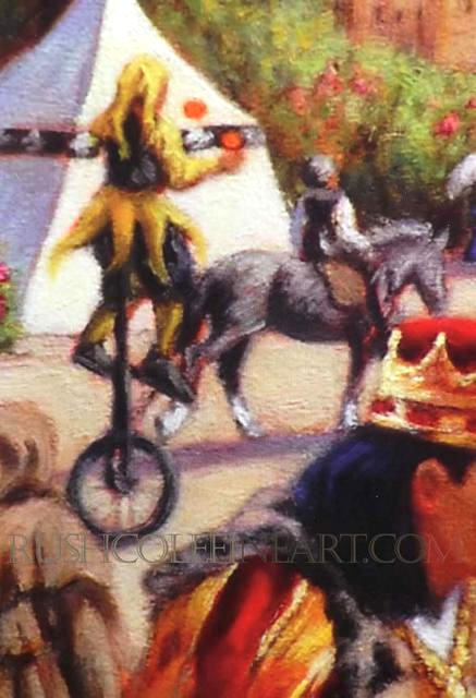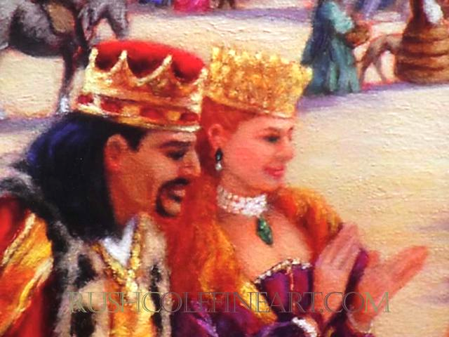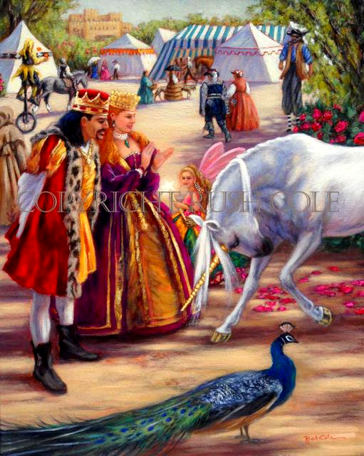 From the moment I made that conscious decision to create art that was the essence of what I felt when attending Renaissance Fairs, I knew there would be a snowy white unicorn, front and center, bowing to royalty. Unicorns are mentioned numerous times in widely ranging cultures and sources from around the world, including the Bible. Several ancient Greeks also wrote of them, although not as part of their mythology, but as an element of their ordinary reality. Descriptions of unicorns vary; however, they are all purportedly attracted to those who are pure of heart and mind, kind and virginal in nature.