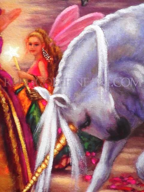 Unseen by the unicorn and nobility, a diminutive fairy drifts by, her beautiful face softly smiling. Again, I delighted in fashioning her clothing, combining rich green with pumpkin orange and hot geranium pink for her dress. Long blonde hair tumbles down her back while bling earrings glitter in strands of diamonds from her delicately pointed ears. Soft rose pink wings are folded behind the fairy; she lights her way with a glowing starry wand and strews rose petals in her path.